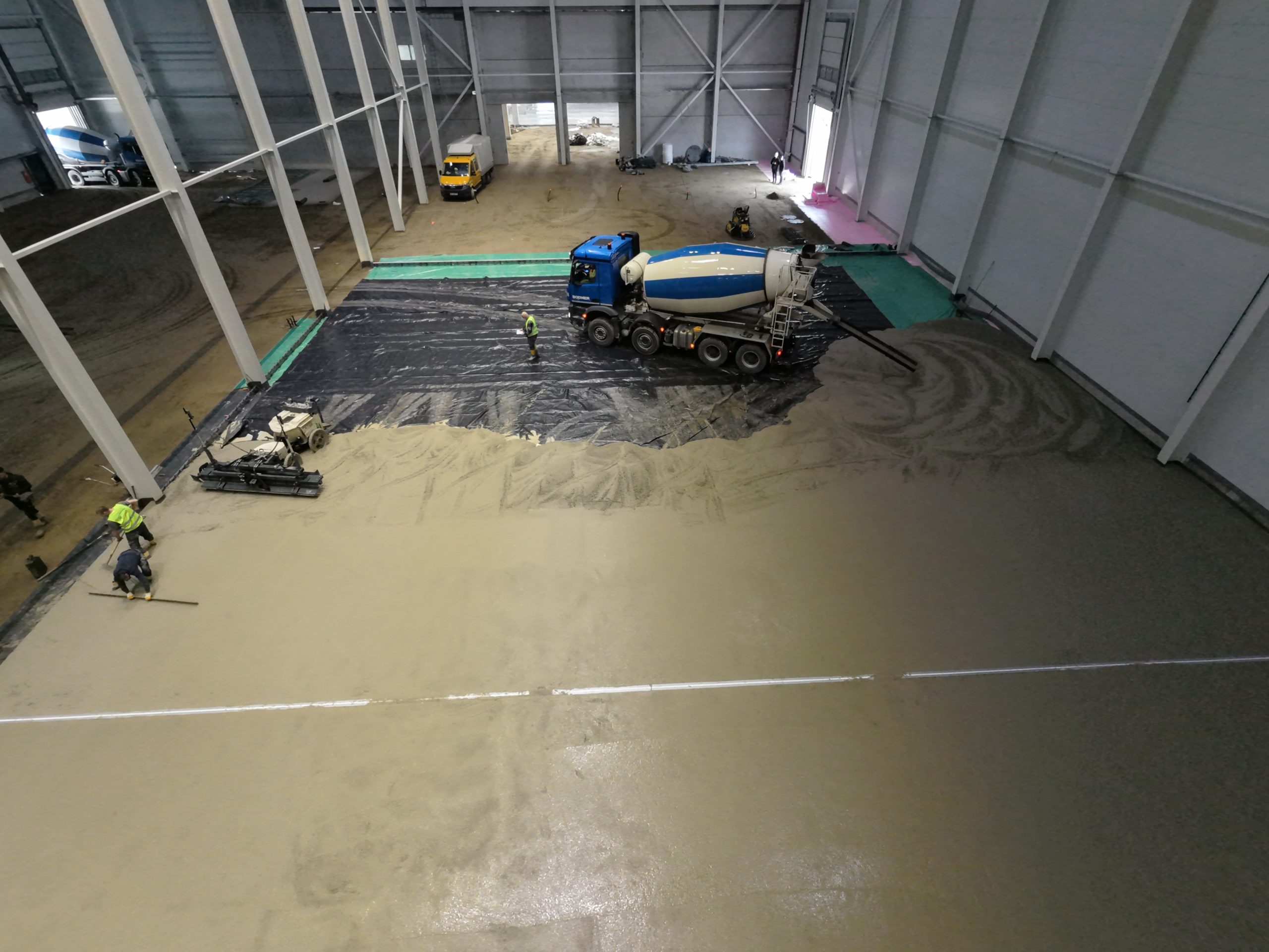 • Concrete slab: About 1,250 m³ of concrete were delivered by around 140 mixer trucks. The high requirements for the future hall floor demanded the utmost precision during installation and a logistical masterpiece on site.